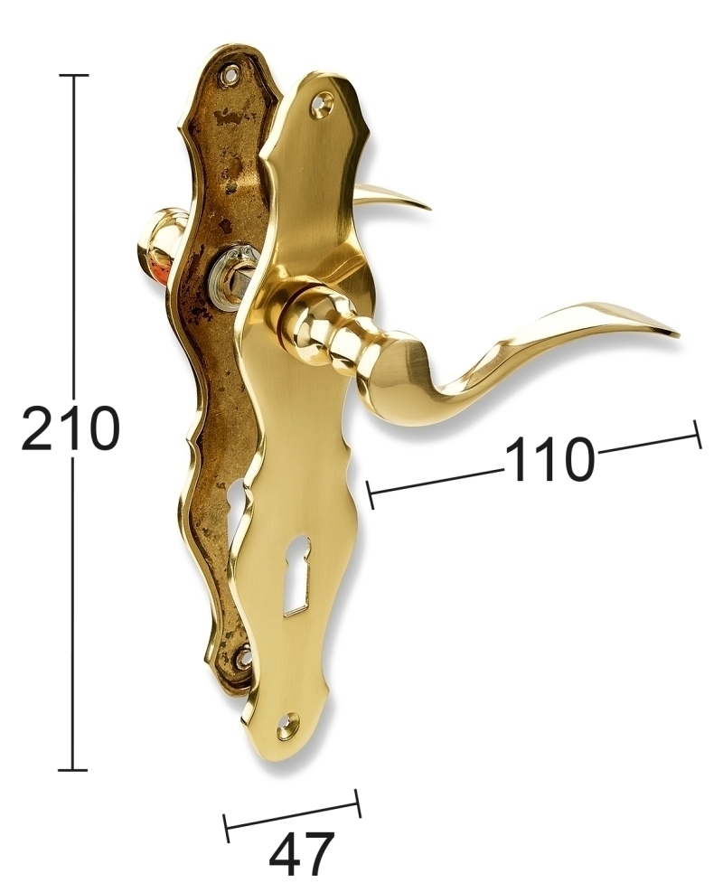 Messing dørhåndtak. Klassisk dørhåndtak med støpt lang plate passer godt i gamle hus. For innerdører 38–42 mm. Utstikk 65 mm.