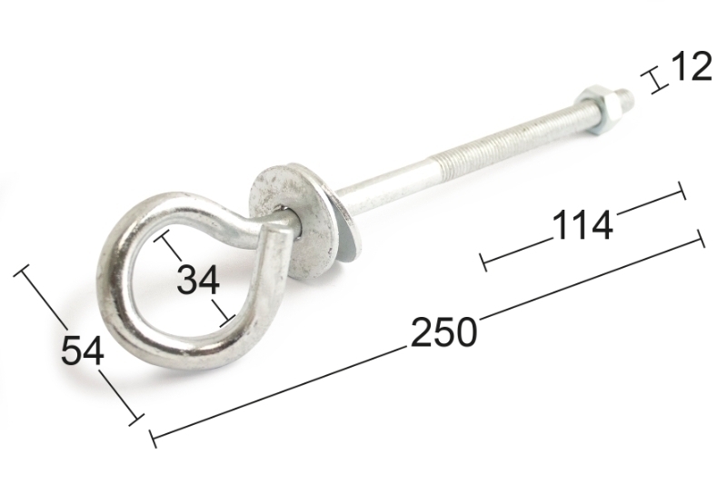 Svingkrok i varmgalvanisert stål. M12-gjenger og totallengde på 250 mm. Skive og mutter inkludert. Anbefalt maksbelastning på 250 kg. er estimert og ikke garantert. Leveres i en 1-delt pakke.